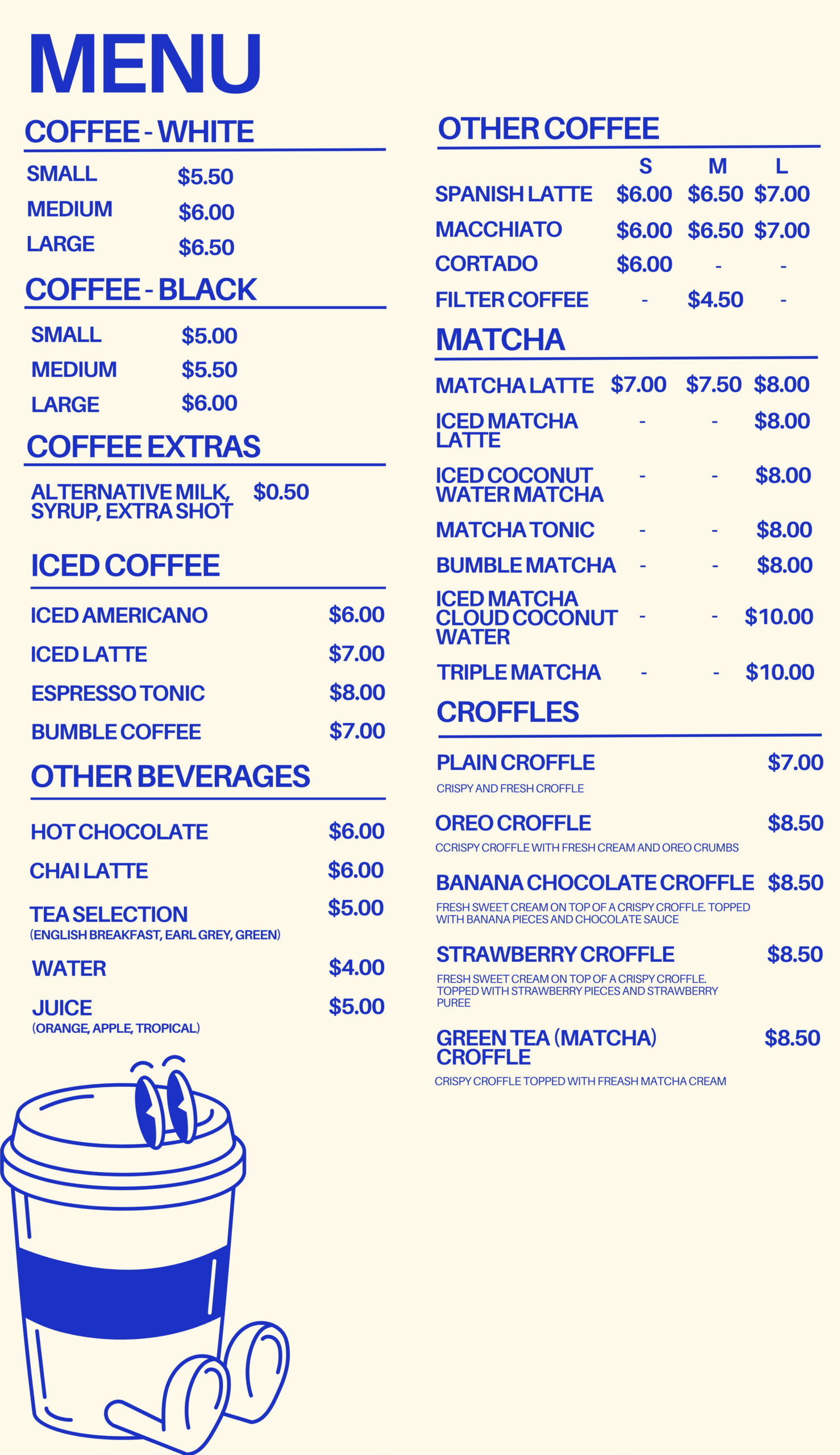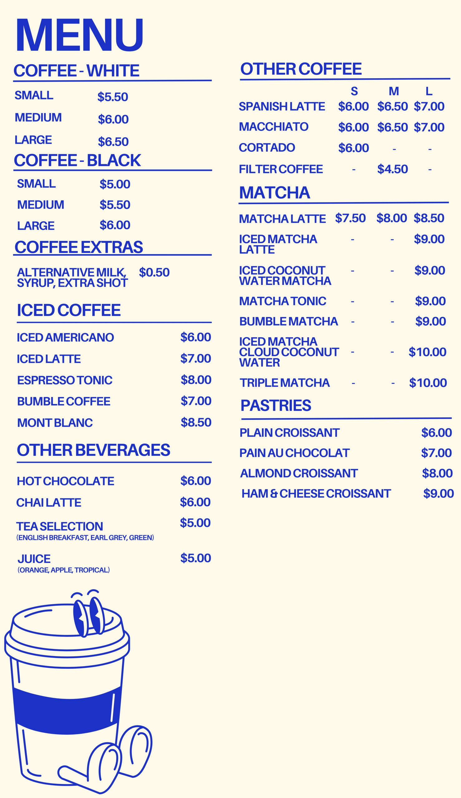 – classic coffees, matcha drinks, cold drinks, teas and tasty bites.